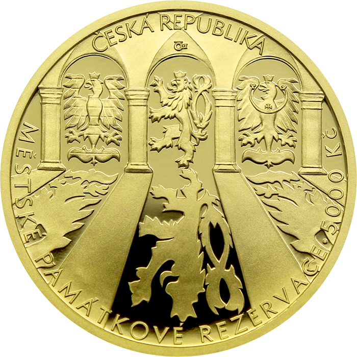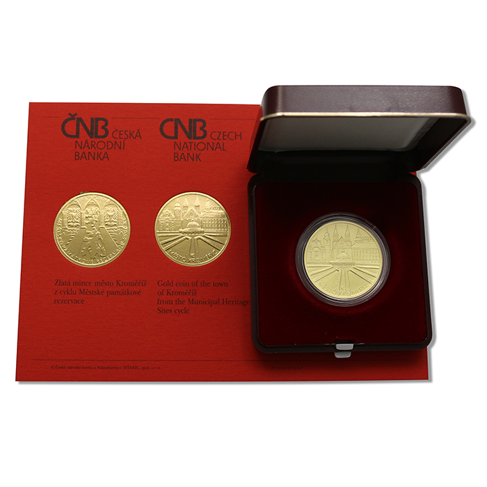 1/2 Oz zlatá pamětní mince - Městská památková rezervace Kroměříž-Proof Na rubové straně mince je v horní polovině koláž nejvýznamnějších architektonických památek Městské památkové rezervace Kroměříž. Zleva kostel Nanebevzetí Panny Marie, kostel sv. Mořice, Arcibiskupský zámek a v dolní polovině mince je umístěna Rotunda v Květné zahradě. Při spodním okraji mince je text "MĚSTO KROMĚŘÍŽ". Rok ražby "2023" je umístěn nad zobrazením Arcibiskupského zámku. Iniciály autorky mince Karolíny Kučerové, DiS. se nacházejí při spodním okraji mince. Na lícní straně je v horní polovině mince ztvárněna část kolonády v Květné zahradě v Kroměříži s heraldickými zvířaty z velkého státního znaku mezi jednotlivými sloupy. Uprostřed český lev, vlevo od něj moravská orlice a vpravo od něj slezská orlice. V dolní polovině mince jsou ztvárněny stíny heraldických zvířat a sloupů. V horním okraji mince je v opisu text "ČESKÁ REPUBLIKA". Při spodním okraji mince se nachází text "MĚSTSKÉ PAMÁTKOVÉ REZERVACE" a označení nominální hodnoty mince se zkratkou peněžní jednotky "5 000 Kč". Počátky města Kroměříž sahají do středověku. Trhová osada, ležící při brodu na křižovatce důležitých obchodních cest a spojuje Podunají a Balt, je zanesena do arabské mapy Tabula Rogeriana jako Arga. První písemná zmínka o osadě Kroměříž pochází z roku 1107. Tu v roce 1110 prodává olomoucký kříže Ota II. Černý olomouckému biskupovi Janu Břichatému za 300 hřiven. Král Přemysl Otakar II. tuto biskupskou držbu potvrzuje roku 1207. Tím se Kroměříž na dlouhá staletí stává majetkem olomouckých biskupů, kteří výrazně ovlivnili architekturu a rozvoj města.Kroměříž na město povýšil biskup a králův rádce Bruno ze Schauenburka kolem roku 1260. V blízkosti původního osídlení vzniká hradbami chráněné město se třemi branami a gotickým hradem jako letním reprezentativním sídlem olomouckých biskupů. Centrum města tvoří nové tržiště čtvercového půdorysu s radnicí a sítí ulic. Západně od Velkého náměstí je založena kolegiátní kapitula s kostelem sv. Mořice. Požárem poničený kostel sv. Václava získává velkorysý gotický vzhled katedrály. Na přelomu 15. a 16. století přichází nový rozkvět města zdevastovaného v období husitských válek. Biskup a humanista Stanislav Thurzo přestavuje gotický hrad na renesanční zámeckou rezidenci.Další rány městu zasadilo švédské vojsko za třicetileté války a přivlečená morová epidemie. Město bylo dvakrát za sebou vypleněno a vypáleno. Z původních 244 domů uniklo zkáze pouze 69. Rozsáhlou obnovu města zahajuje biskup Karel II. Lichtenštejn-Kastelkorn ve 2. polovině 17. století. Zničený Arcibiskupský zámek je znovu vybudován v honosném raně barokním slohu. Původní zelinářská a ovocnářská zahrada je přebudována v barokní Podzámeckou zahradu a v roce 1665 je založena unikátní okrasná Květná zahrada. Na Sladovnickém náměstí je vybudována biskupská mincovna, která je v současnosti poslední dochovanou mincovnou na Moravě. Měšťanské a církevní stavby ve městě získávají vzhled, který si Kroměříž z velké části ponechala do dneška. Historické jádro města, jehož součástí jsou pozůstatky městského opevnění, Arcibiskupský zámek a obě zahrady, bylo vyhlášeno v roce 1978 městkou památkovou rezervací.